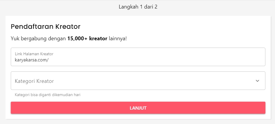 The process of registering as a creator on KaryaKarsa is easy, quick, and FREE! So, when you go to www.karyakarsa.com or open the KaryaKarsa app that you have downloaded, just press the red button "REGISTER AS A CREATOR." Then you only need to go through the following 2 steps.