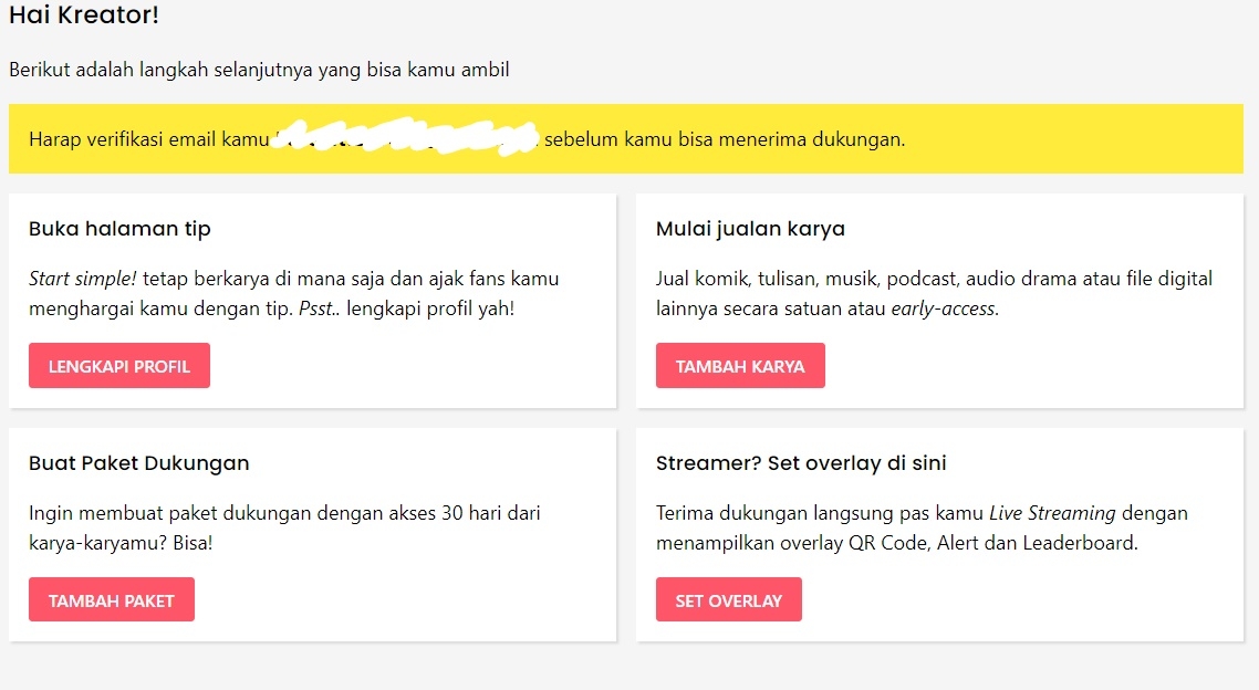 If you have just created an account, you will definitely receive a notification to activate your email. The notification will appear on the Creator Dashboard, in a yellow notification box, as shown in the image below.