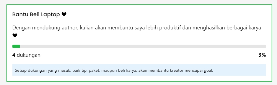 Description. Now in this section you can explain the detailed meaning of your goal. Example: "The results of the support will be used by Mimin to buy a new laptop and lunch to keep the spirit of producing works until it can reach 100 pieces".