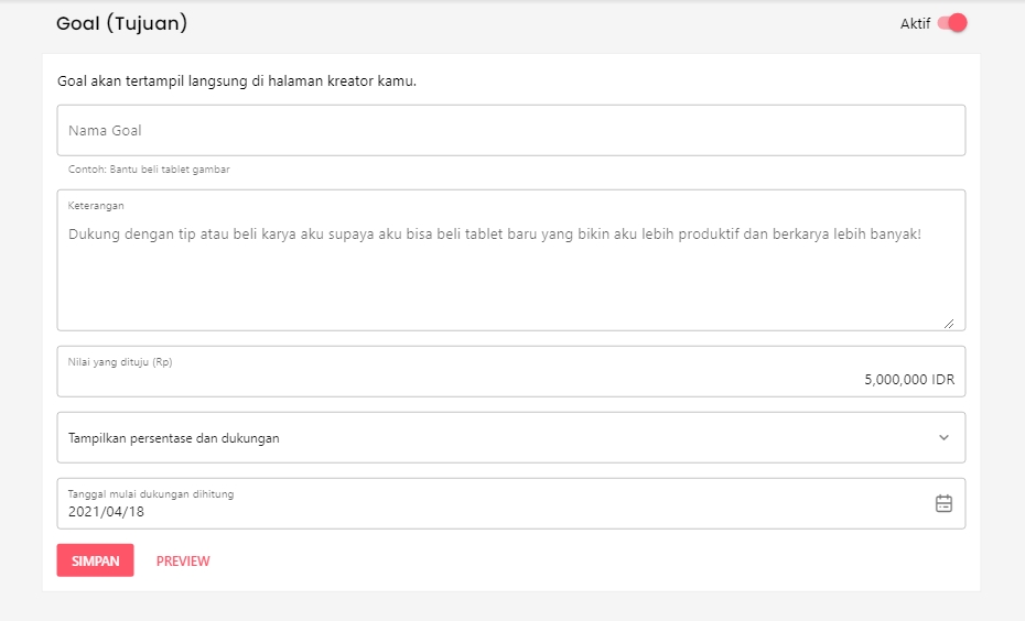 [Display support overview] atau [Display amount]. You may be uncomfortable if your goal/objective is shown in the form of a monetary amount. Well, you can choose to display the percentage of support only.