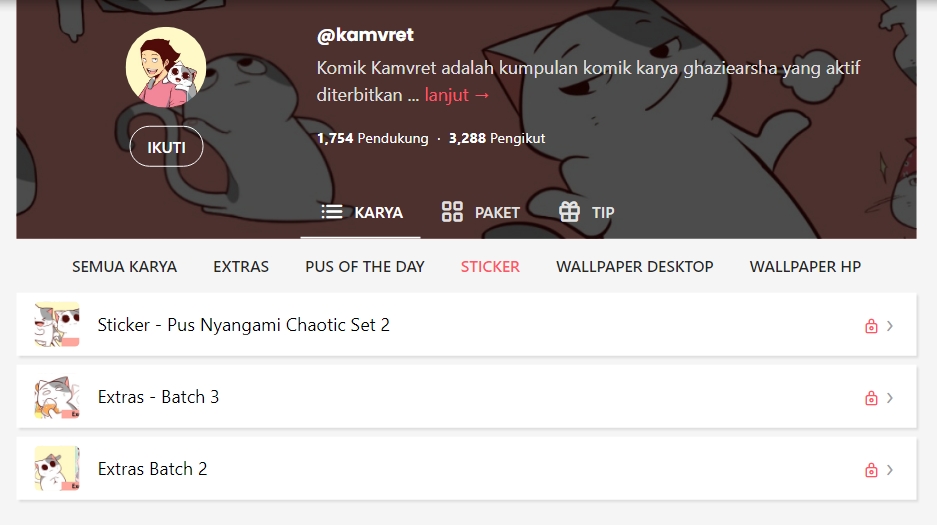 The work category is a menu creation feature on the creator's main page. The menu can be filled with various work posts. For example, you can see the screenshot from the Komik Kamvret account below.