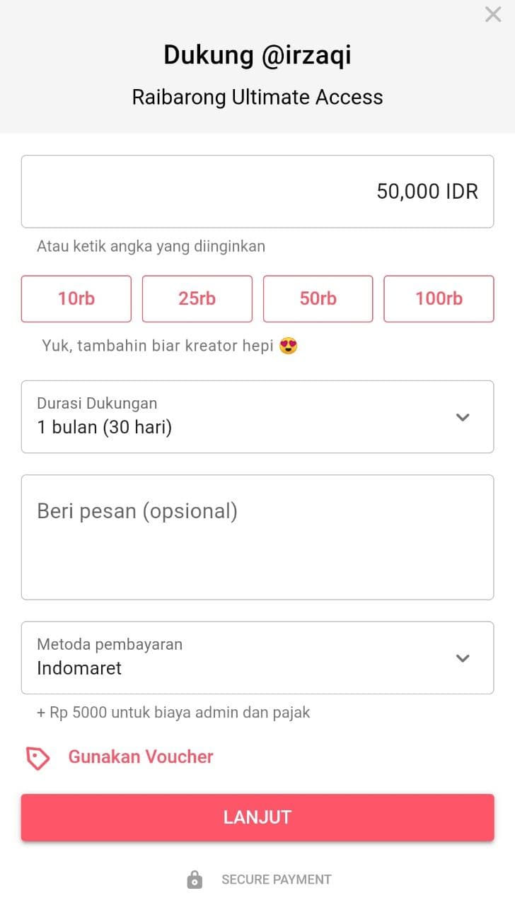 2. Select "Indomaret" in the Payment Method section. You can give more appreciation by adding the amount you want to pay. Or it can be easier by giving a tip. After that press "CONTINUE".