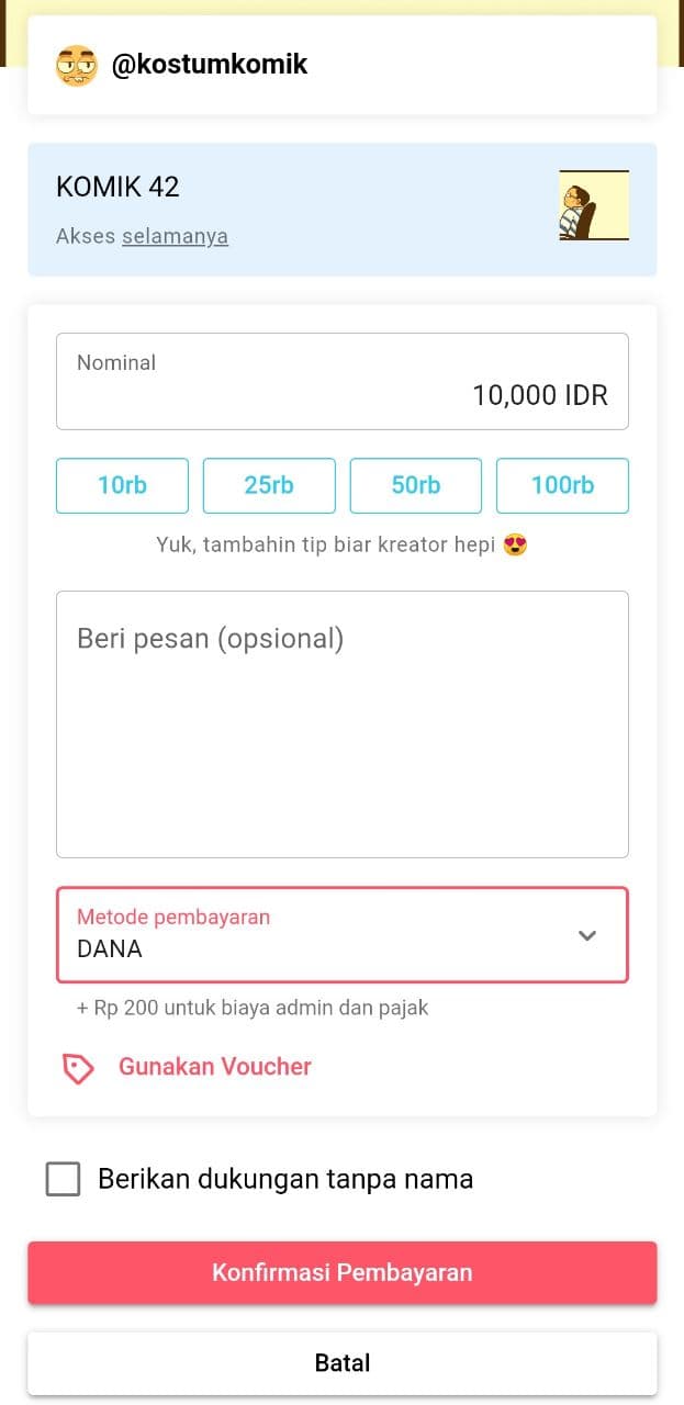2. Select "DANA" in the Payment Method section. You can give more appreciation by adding the amount you want to pay. Or it can be easier by giving a tip. After that press "Confirm Payment".