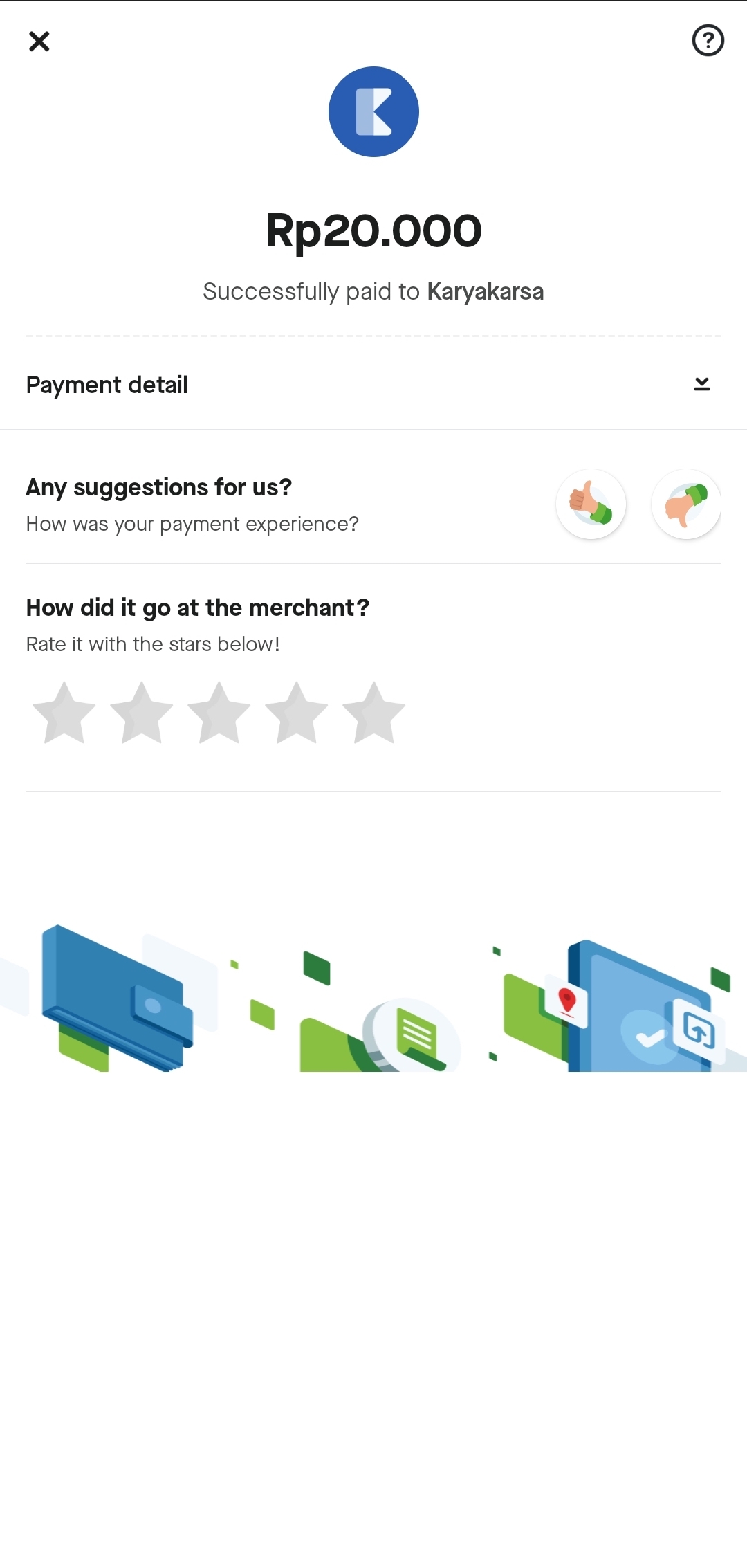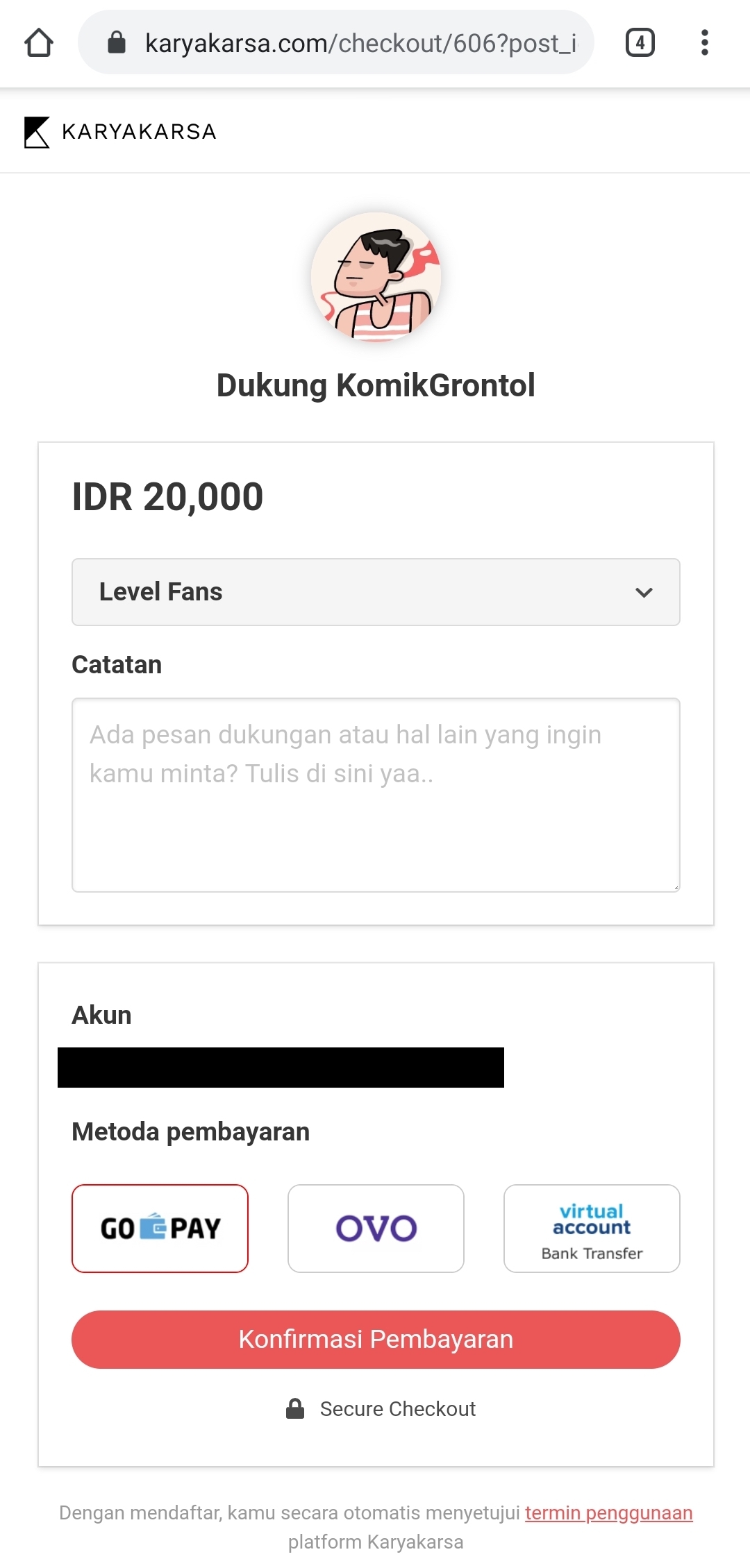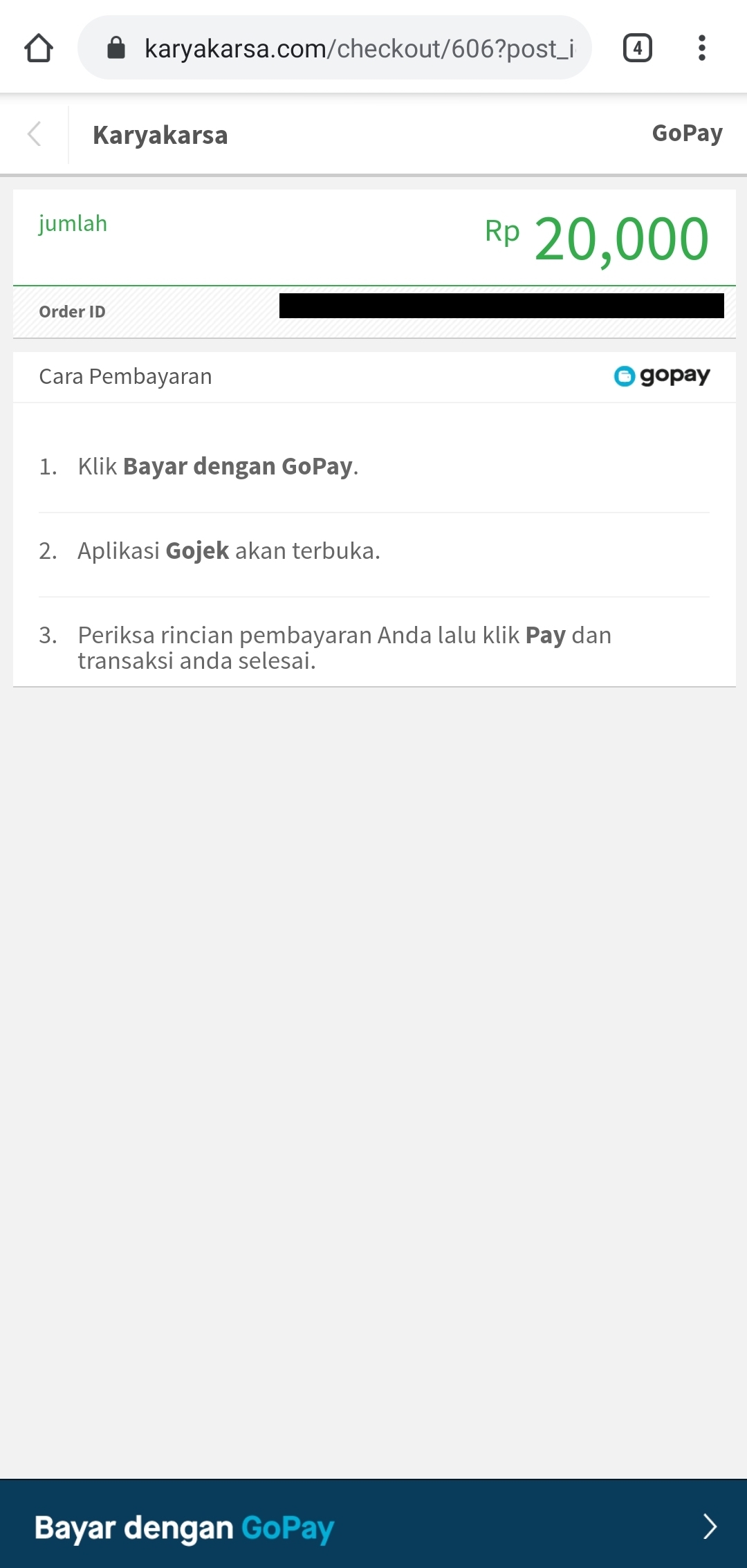 Make sure you select the "GoPay" button before pressing "Confirm Payment". Update: you can link your GoPay e-wallet to KaryaKarsa so that your GoPay balance can be viewed before making the transaction.