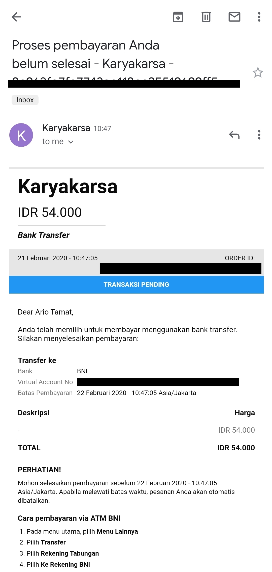 6. You will also receive an email from the payment service provider on behalf of KaryaKarsa, reminding you to complete the payment. You have a 24-hour window to complete this payment.