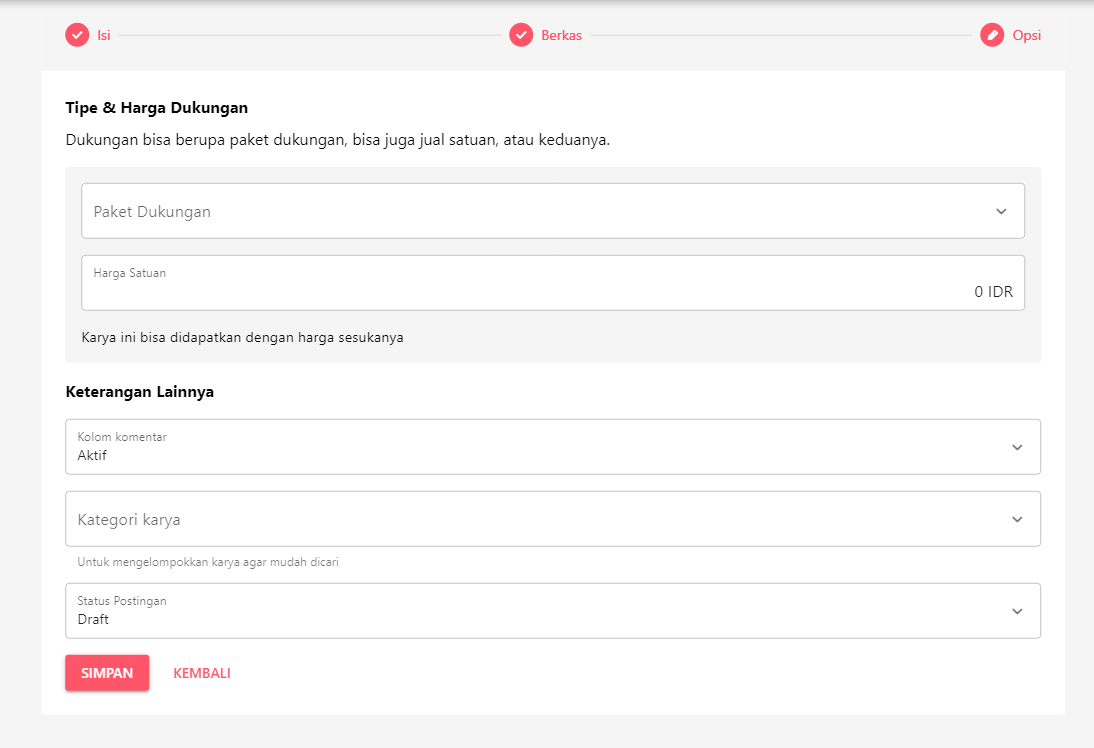 Tentukan harga karya, dan apakah karyanya dijual secara gratis, satuan, paket, atau satuan DAN paket di setelan berikut. Lebih banyak soal pilihan cara jual dapat dibaca di sini.
